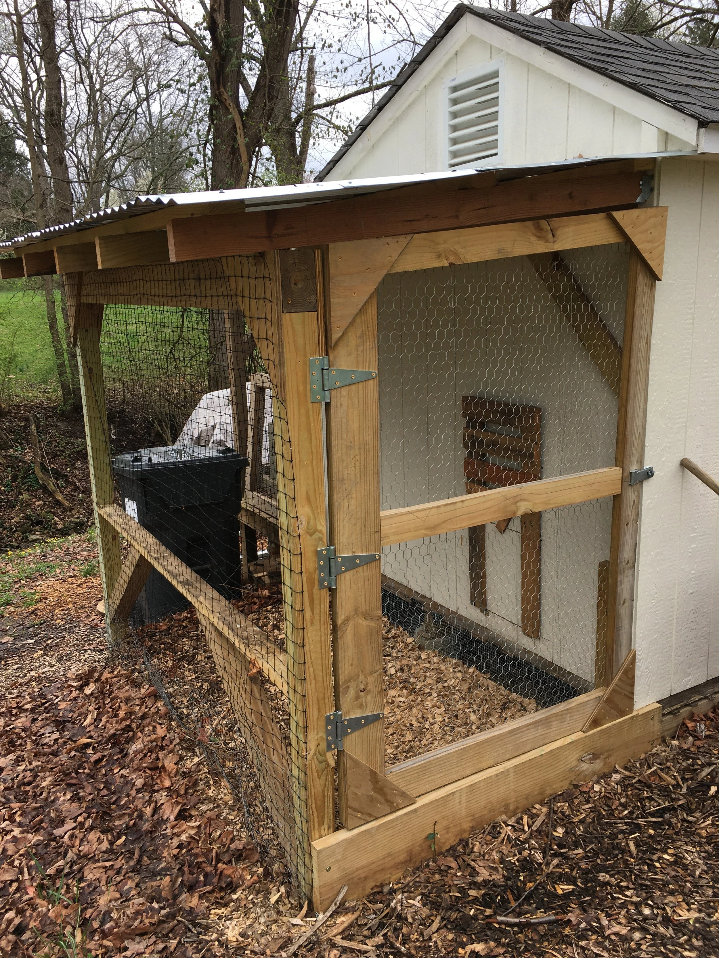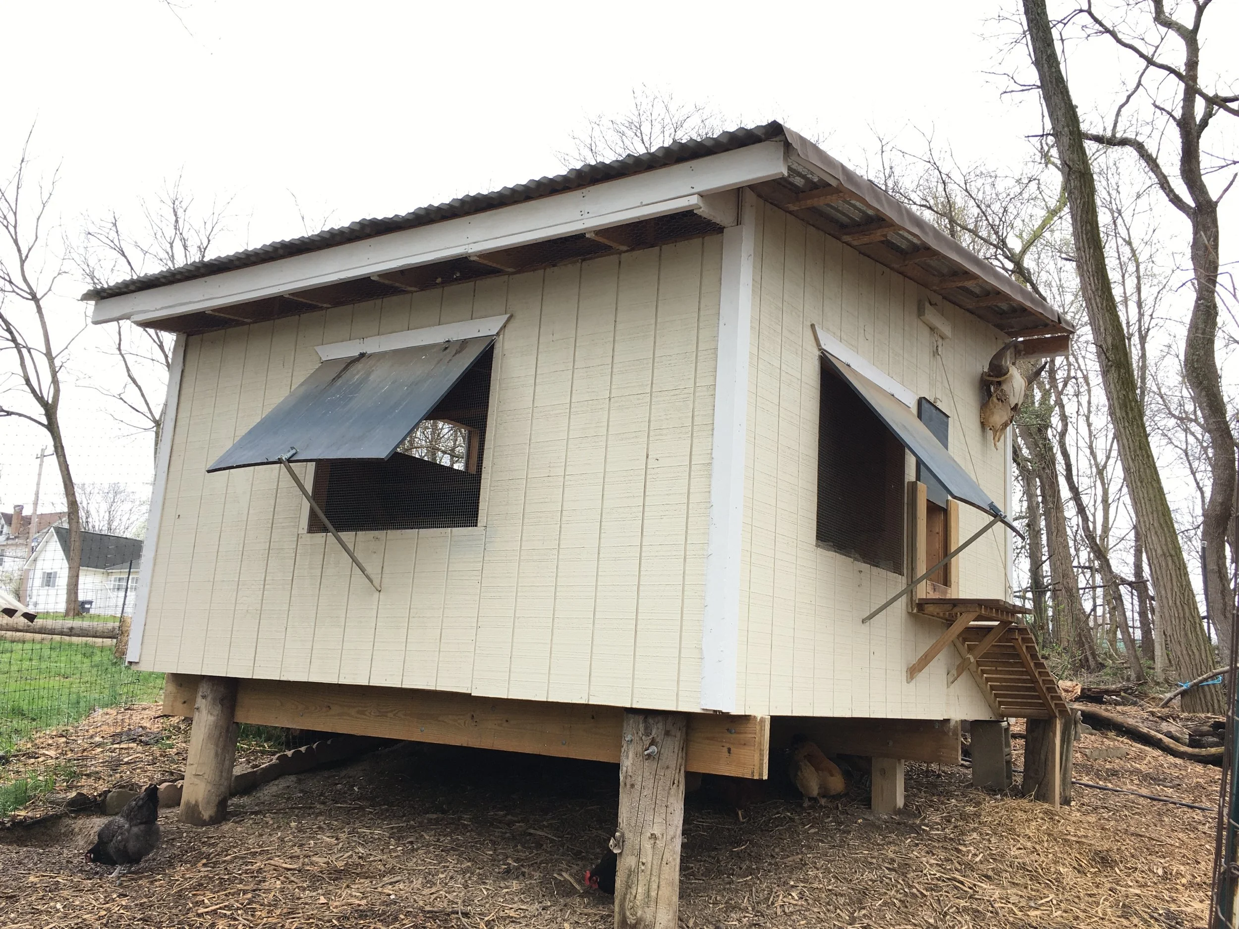 Exterior construction: chicken coop, shed, deck, play structure, fence/gate, tree and brush removal, garden beds
